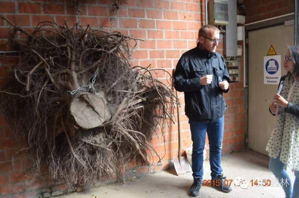 參觀團(tuán)全程由泰樂先生陪同講解,是負(fù)責(zé)銷售比利時(shí)、荷蘭市場(chǎng)的經(jīng)理,學(xué)習(xí)森林植物學(xué)專業(yè)后一直在苗木產(chǎn)業(yè)工作,和之前參觀最大的不同點(diǎn)就是懸掛在墻上的根系,并詳細(xì)講解根系健康的重要性,具有健康旺盛的根系才是合格的商品苗木。