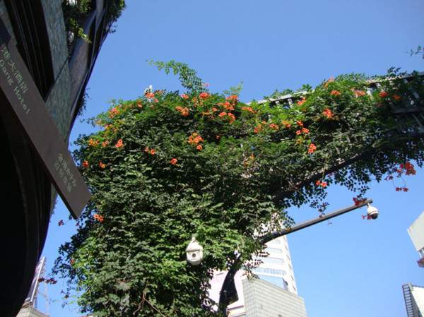 在用鋼構(gòu)件制作成的圓柱周邊,種上幾株凌霄,加強(qiáng)水肥管理,三、兩年就可爬滿圓柱,花開時(shí)節(jié),滿柱紅花,給人以賞心悅目之感。