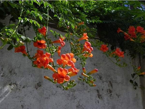 凌霄具有較強(qiáng)的攀援能力,將其栽植于建筑物的西山墻,幾年時(shí)間,便可爬滿墻體,不僅起到了綠化美化作用,還可有效降低夏季的室溫?;ㄩ_之時(shí),滿墻紅花,好似花瀑一般,隨風(fēng)搖曳,美輪美奐。